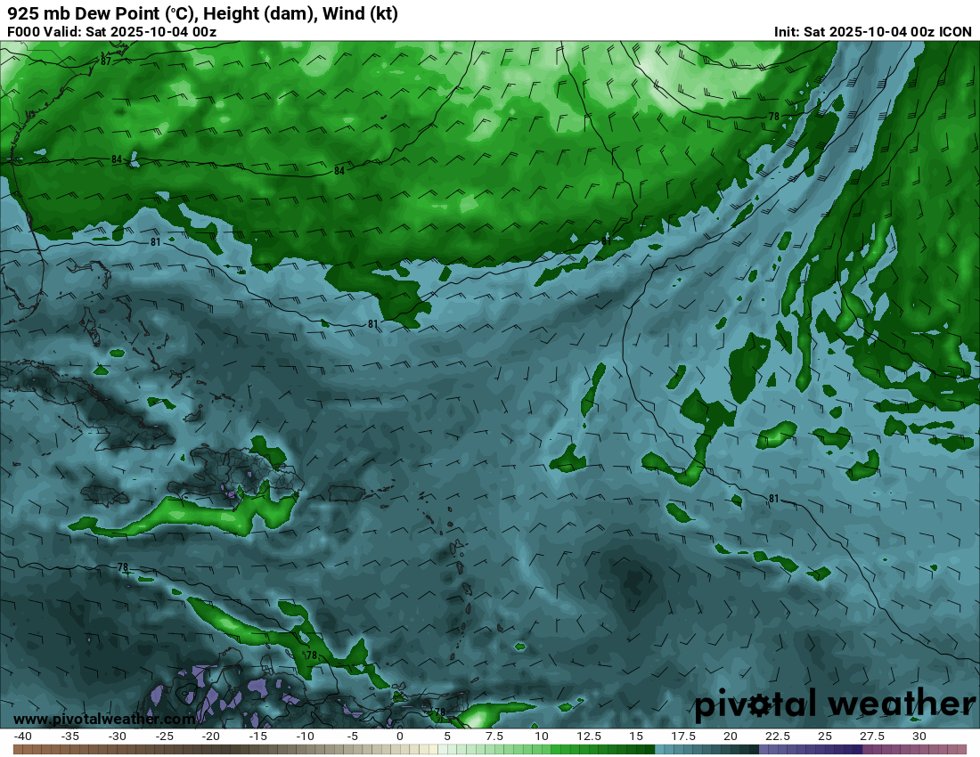 925 mb Dew Point, Height, Wind Barbs